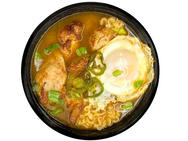 Spicy ramen bowl made with roasted chicken, spicy broth, ramen noodles, grilled jalapenos, scallions & a fried egg.