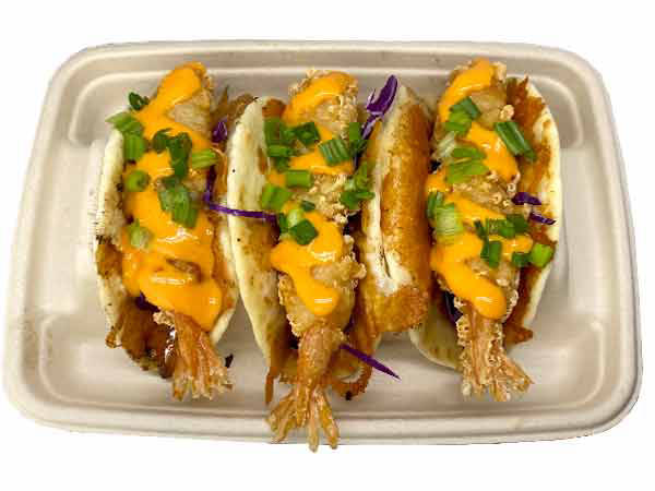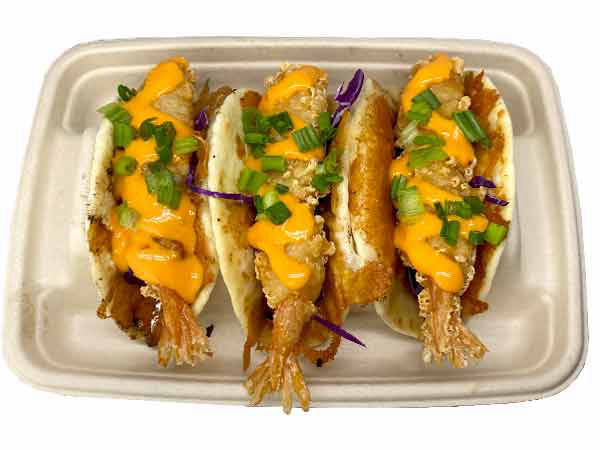 Deep fried battered jumbo shrimp, red cabbage, boom boom sauce & scallions.